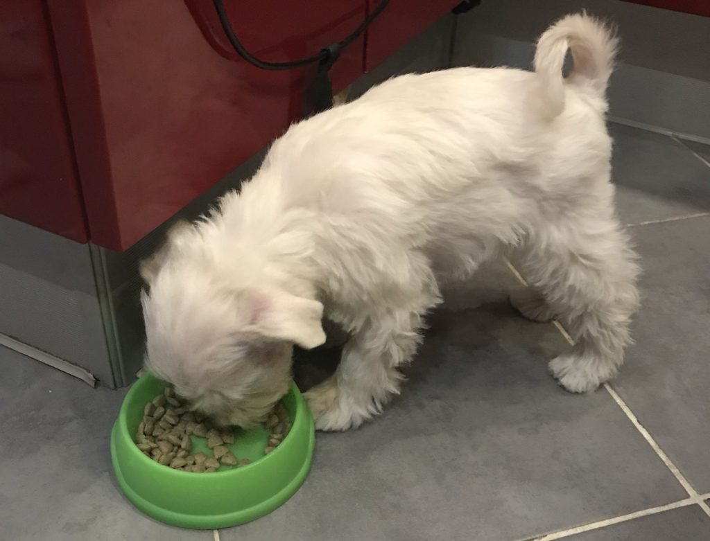 U prvih šest mjeseci je potrebno vašim psićima ponuditi četiri obroka dnevno po 40-50 grama visokokvalitetne hrane. Naše iskustvo je da niti jedna od njih tri nije nikada htjela pojesti četiri obroka dnevno, pa smo mi to smanjili na tri. Ali to ćete već vidjeti kako će htjeti jesti u njegovo i vaše vrijeme privikavanja na vašeg novog kućnog ljubimca. Hrana bi trebala sadržavati visoki udio proteina, oko 30 grama, i oko 20 grama masti. Ne zaboravite vašem ljubimcu ponuditi dovoljno vode ukoliko jede tvrdu tvorničku hranu, poznatiju kao granule.